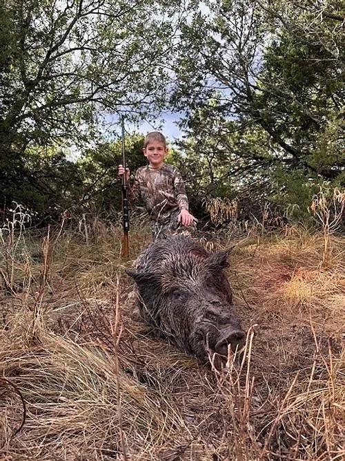 Despite the weather rolling in this young hog hunter waits for the last second and bags the game.